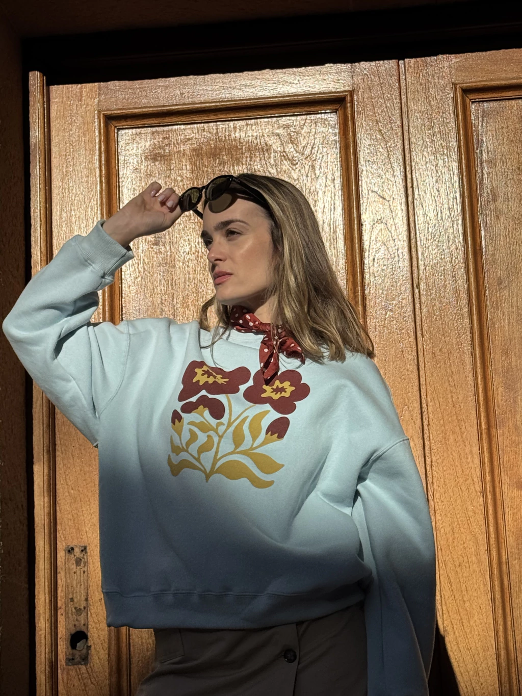 Buzo oversize confeccionado en frisa de algodon PREMIUM color celeste, estampado en color bordo y oliva.